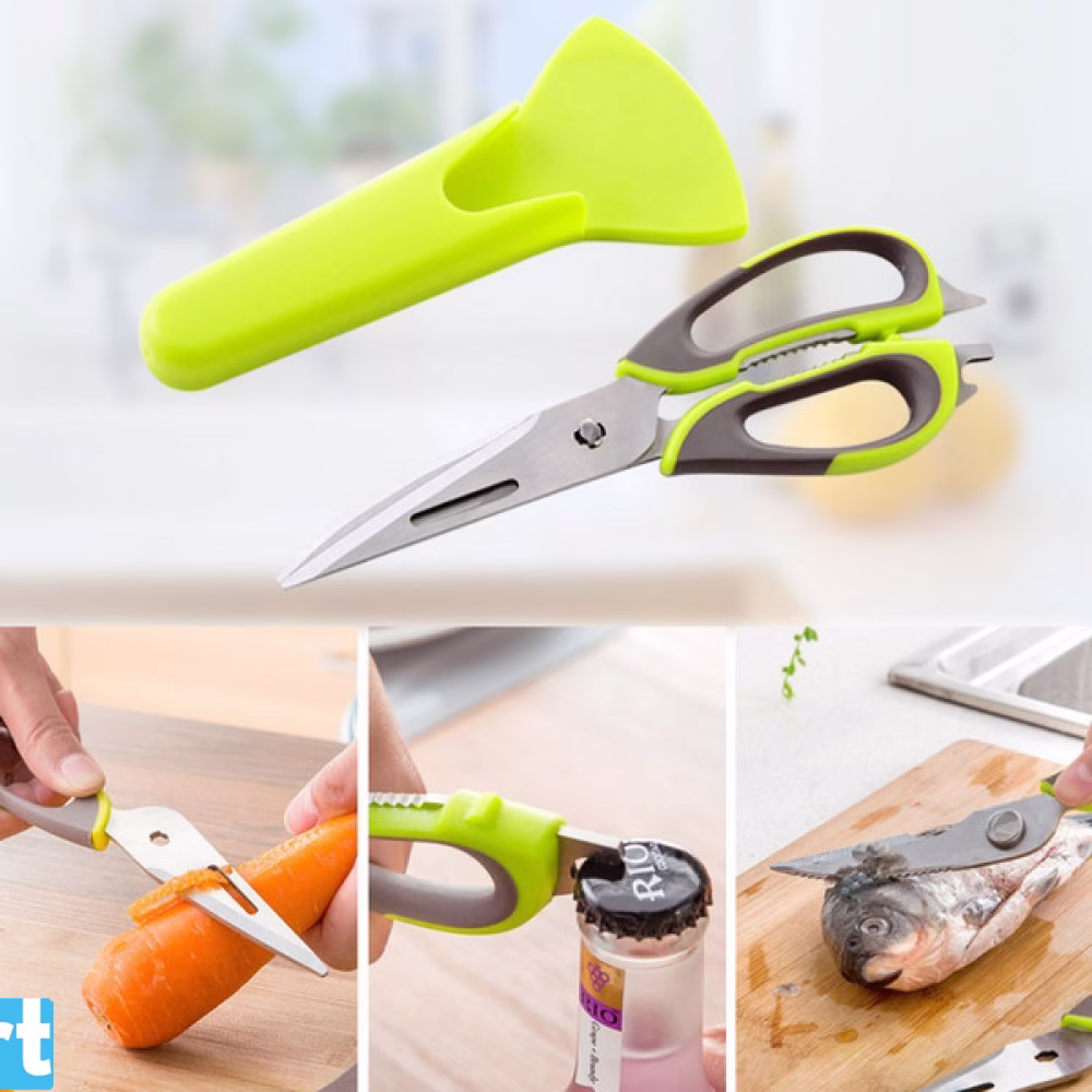 مقص 9 في 1 متعدد الاستخدامات عملى وهيبقي دراعك اليمين في المطبخ، علشان هتقدري تستخدميه في كل حاجة تقريباً: تقطيع الطيور والخضار وتقشير السمك وتقشير البطاطس والخضار وممكن تفصليه ويبقي سكينتين لتقطيع العيش.. وغيرها من الاستخدامات.