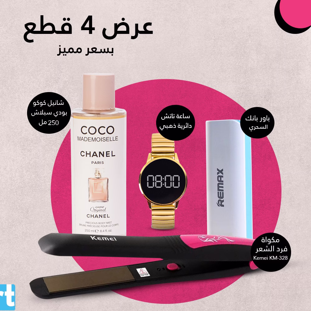 • * مميزات مكواة فرد الشعر Kemei KM-328 * • هتقدري تفردي شعرك بكل سهولة وفي مدة قصيرة 30 ثانية. • هتقدري تستخدميها لتمليس أو تجعيد شعرك. • الجهاز بيشتغل على 4 مستويات من الحرارة حسب درجة فرد الشعر اللي انتي عايزاها. • مزود بمؤشر ضوء LED عشان يوضح إذا كان الجهاز في وضع التشغيل أو الغلق. • الجهاز بيغلق تلقائيًا لما بيوصل سطح المكواة إلى الحرارة. • المكواة سطحها الداخلي من السيراميك مطلي. • * وصف مكواة فرد الشعر Kemei KM328 * • الماركة: كيمي. • القوة: 25W. • الجهد : 220V • التردد : 50/60HZ. • وقت التسخين :1/2 Min • درجة الحرارة: من 160 إلى 220 درجة. • عدد إعدادات درجة الحرارة: 4. • وزن المنتج : 225 جرام. • * مميزات باور بانك السحري * • – سعة البطارية كبيرة هتشحنلك موبايلك اكتر من مرة في اليوم . • – فيه مكان لوصلتين عشان تقدر تشحن اكتر من موبايل في نفس الوقت. • – فيه لمبات ليد بتوضح نسبة الشحن. • – حجمه خفيف و الخامة بلاستيك صعب الكسر و هتقدر تتحرك بيه في اي مكان. • * وصف باور بانك السحري * • – سعة البطارية :- 10000 ملي امبير. • – المداخل :-ميكرو 5 فولت/2 امبير. • – المخارج :-يو اس بي1،3 5:- فولت/1 امبير، يو اس بي ،42:- 5 فولت/2 امبير. • – الخامة :- بلاستيك . • – محتوى العبوة. • 1×باور بانك . • * مميزات شانيل كوكو بودي سبلاش 250 مل * • ريحتة قوية و ثابتة هتفضل معاكي اليوم كله. • حجم السبلاش 250 مل يعني هيكفي استخدامك لفترة طويلة. • سهل تاخديه معاكي في مشوارك او خروجتك. • إفتتاحية العطر البرتقال, اليوسفي, البرغموت وزهر البرتقال. • قلب العطر الورد التركي, الياسمين, الميموزا و الإيلنغ. • * وصف شانيل كوكو بودى سبلاش 250 مل * • الماركة: شانيل. • الموديل: كوكو مادموزيل. • حجم البودي سبلاش: 250 مل. • مدة الثبات: حتي 8 ساعات. • * مميزات ساعة تاتش دائرية ذهبي * • استيك معدن شبابي مطاطى. • بتشتغل بحجارة ساعة. • مريحة جدا و شيك مع كل الاطقم. • استيك مناسب لكل يد. • ضمان 14 يوم. • * وصف ساعة تاتش دائرية ذهبي * • الخامة: معدن. • الاستخدام تاتش. • 18 عقله.