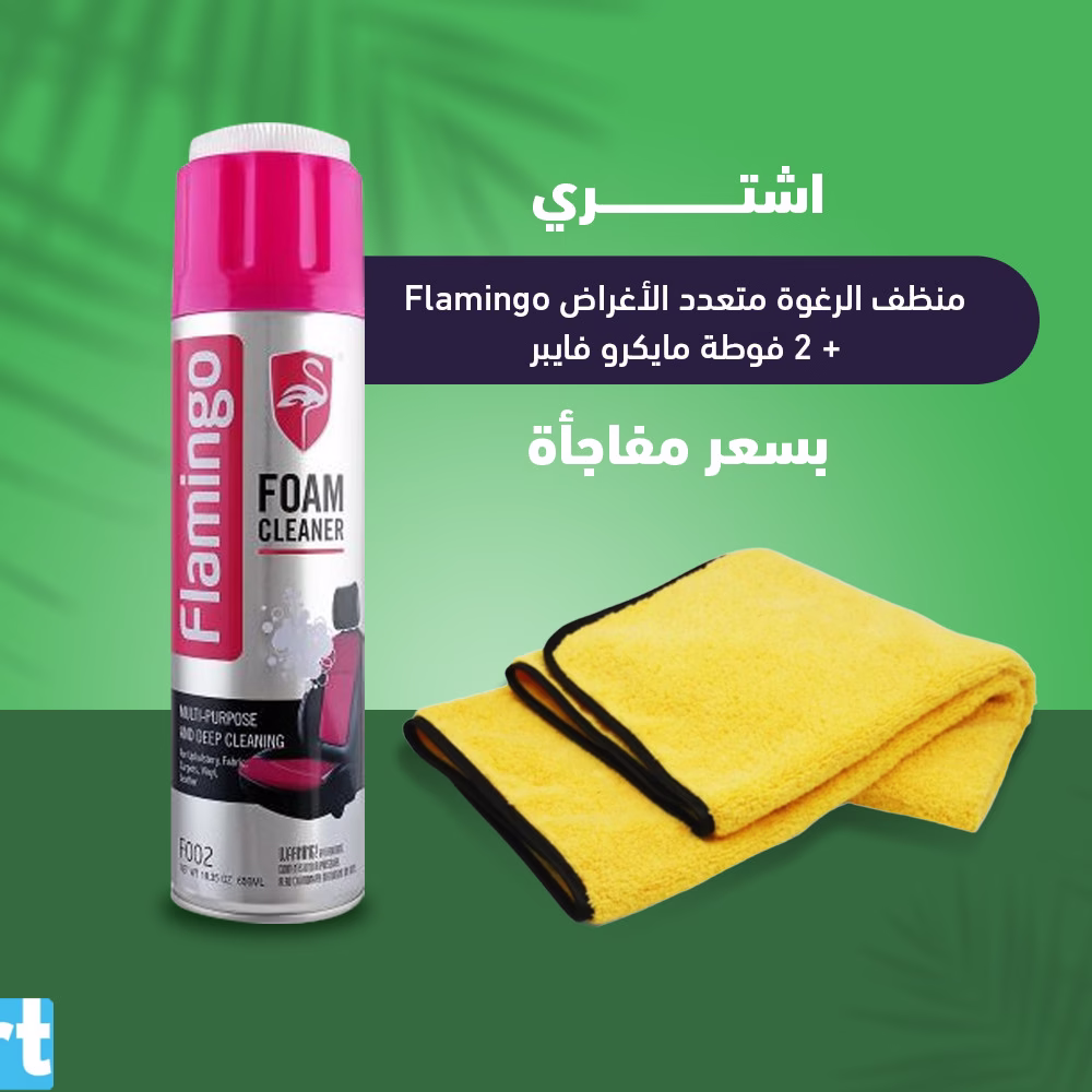 عرض 2 فوطة مايكروفايبر للسيارة و منظف الرغوة متعدد الأغراض Flamingo، منظف رغوة متعدد الاستخدام، فعال، عميق، يعمل على إزالة الأوساخ واستعادة اللون ، معاه فرشاة لتسهيل التنظيف، تقدر تستخدمه في تنظيف السيارة، الأجهزة، الشاشات، السجاد، الأقمشة… هيرجع كل حاجة احسن من الاول والفوطة ميكرو فايبر هتساعدك على التنظيف بسهولة .
