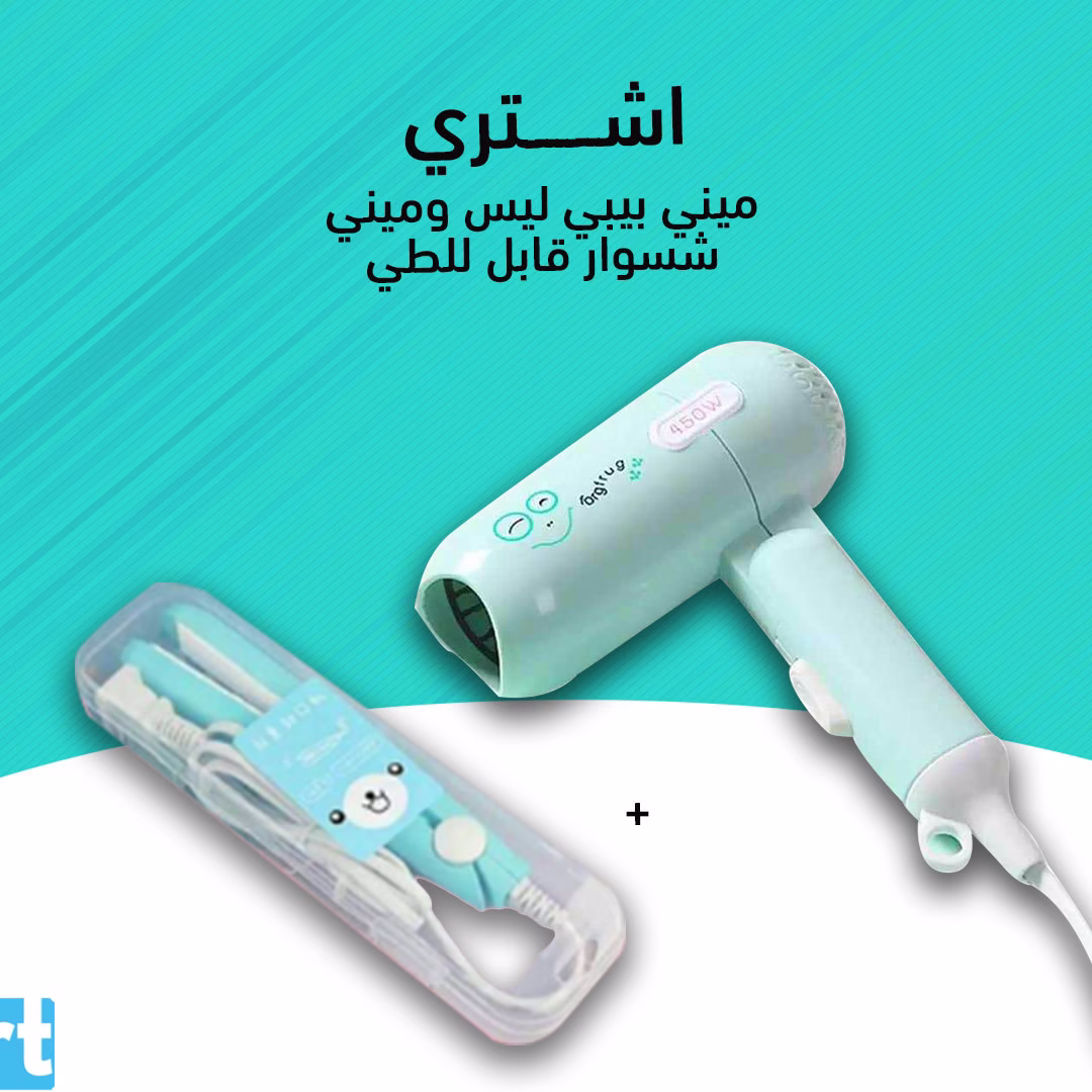 • مميزات ميني سشوار قابل للطي :- • الإسشوار قابل للطي يعني مش هياخد مكان في التخزين. • الإستشوار خفيف و هتقدري تاخدي معاكي في اي مكان ووقت السفر • الإسشوار فيه 2 سرعة علشان تختاري اللي تريحك. • الاسشوار علشان تنشفي شعرك و مالهوش اي تأثير ضار على الشعر. • الإسشوار الوانه جميلة ومبهجة • مميزات ميني بيبي ليس:- • المكواة هتفردلك شعرك بسهولة من غير تعب هتوفري وقت وفلوس الكوافير • المكواة حجمها صغير و مش هتاخد مكان في تخزينها و كمان معها علبة بلاستيك علشان تشليها فيها. • المكواة خفيفة هتقدري تاخديها معاكي في اي مكان • وصف ميني سشوار قابل للطي:- • مصدر الطاقة: 110 فولت / 220 فولت ، 50،60 هرتز. • 450 واط • 2 سرعة • لون:- عشوائي • وصف ميني بيبي ليس:- • درجة الحرارة ١٦٠ • الخامة:- بلاستيك. • 20 فولت • 17.5× 3×2 • 110-220V 50HZ • محتوى العبوة ميني سشوار قابل للطي:- • 1× إسشوار. • محتوى العبوة ميني بيبي ليس:- • 1 مكواة • 1 علبة بلاستيك.