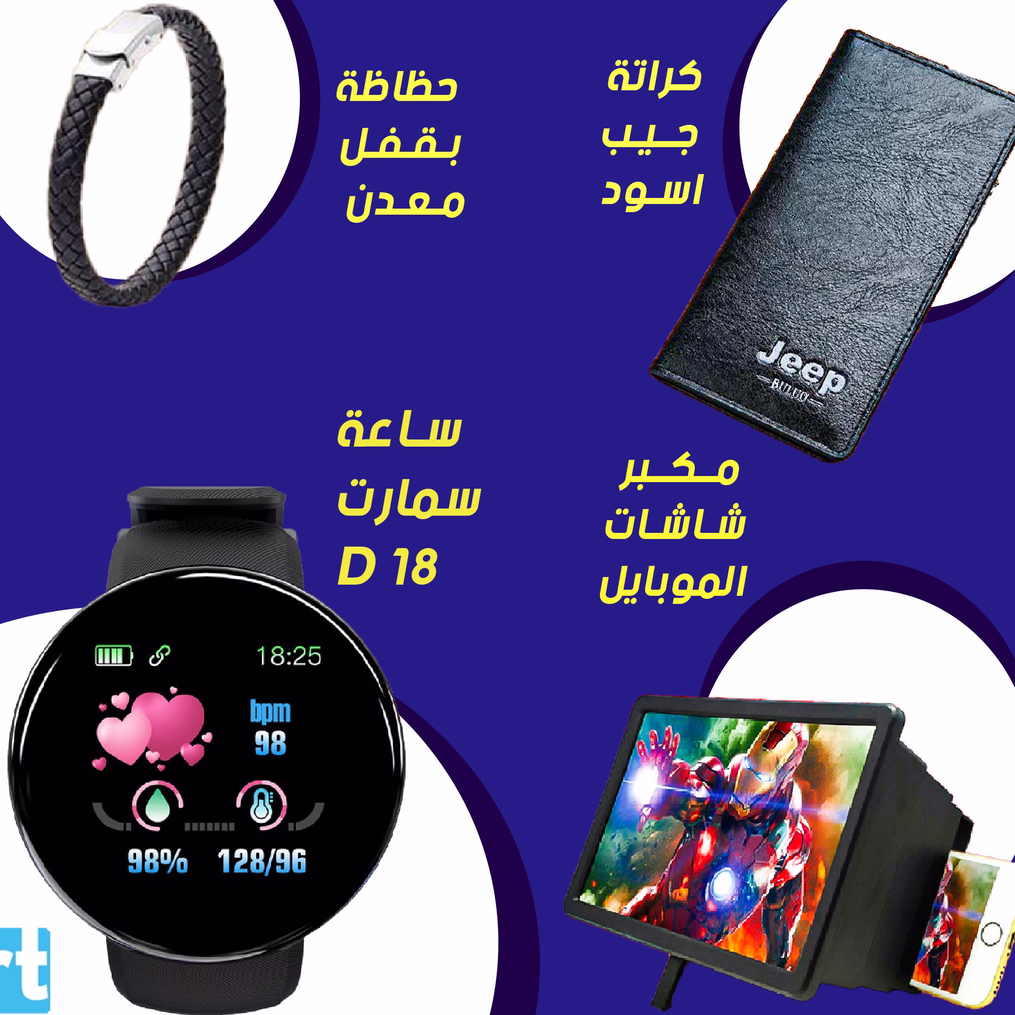 D18 Smart Watch + كراتة جلد Jeep أسود + مكبر شاشات للموبايل F2 + حظاظة يد بقفل معدن
